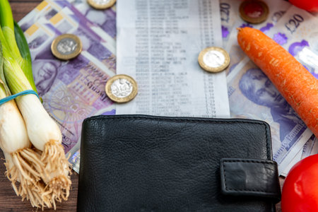 A UK cost of living concept with Sterling bank notes, a grocery receipt, purse and some vegetable groceries.