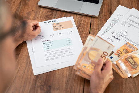 Old man tenant prepares euro banknotes to pay for utility bill at wooden table closeup, mature male tenant with cash money and household expenses invoices, regular payment
