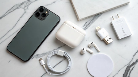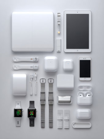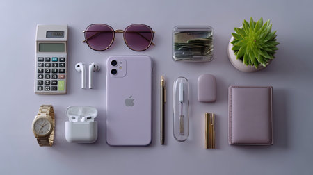 A visually appealing arrangement of modern tech gadgets and stylish accessories on a minimalist background, ideal for showcasing contemporary lifestyle and productivity.