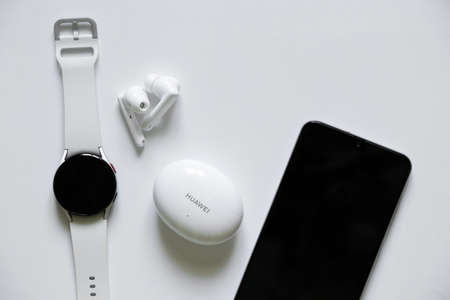 Ukraine Dnipro 11/30/2021 - Smart watches Samsung Galaxy Watch and Headphones inserted without dumbbells TWS Huawei Freebuds 4i and mobile phone, gadgets