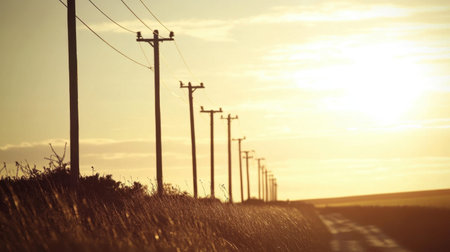 Captivating rural sunset with power lines lining an empty road, inviting viewers to experience the tranquility and serene beauty of the countryside in evening light.