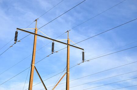 Intermediate, transmission line costs against the sky close-up on a clear, sunny day. power transmission by means of electric current.