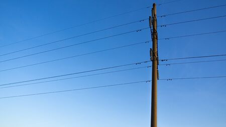 Concrete poles with high voltage wires. Against the background of a blue sky with copy space. Power lines. Supply of electricity, internet and communication. Engineering network. Industrial facility.