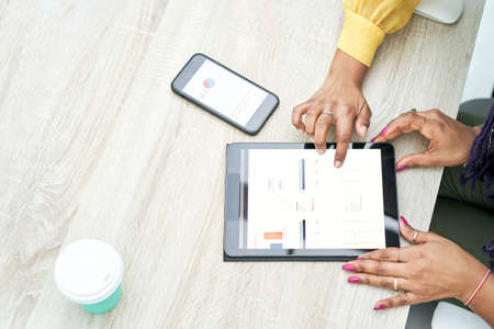 Businesswoman typing on tablet at workplace. Women working in home office hand keyboard