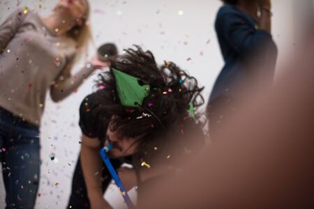 confetti party Multiethnics happy young people group celebrating new year eve while dancing and have fun at home