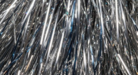Close-up of a shimmering silver tinsel curtain, creating a festive and celebratory backdrop with its reflective and textured surface.