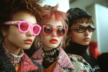 Stylish women with unique hairstyles and vibrant clothing pose together, showcasing their trendy sunglasses and edgy makeup before a fashion show in an urban venue.
