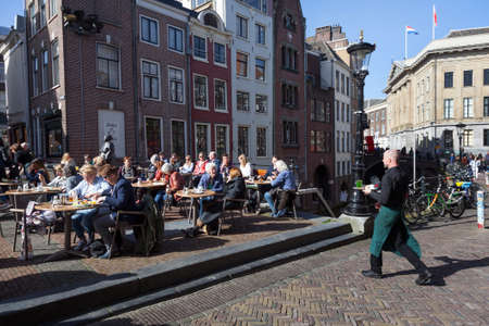 Utrecht, netherlands, 15 march 2017: people enjoy sunny day in early spring on open air cafe at vismarkt in the dutch city of utrecht