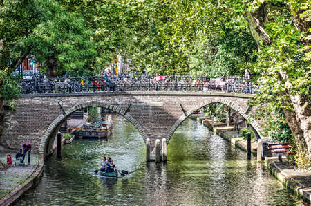 Utrecht, Netherlands - August 4, 2016: Canal in historic centre of Utrecht. Ancient city centre features many buildings and structures several dating as far back as the High Middle Ages.