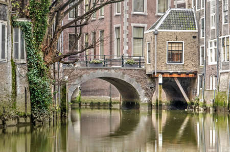 Dordrecht, The Netherlands, January 6, 2019: the arch of a small bridge crossing Voorstraathaven canal in the historic town center