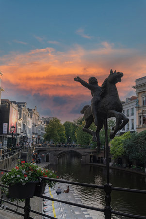 Canal in Utrecht with Bronze Horse Statue and Sunset Sky