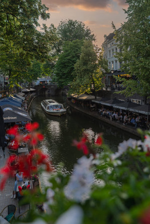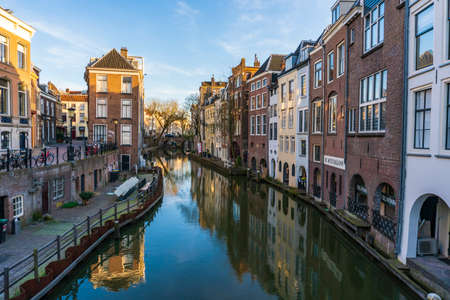 The most famous canals and embankments of Utrecht city during sunset. General view of the cityscape and traditional Netherlands architecture.