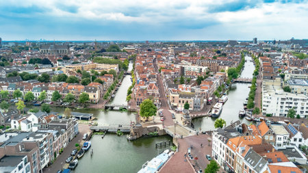Aerial drone view of Leiden town cityscape from above, typical Dutch city skyline with canals and houses, Holland, Netherlands
