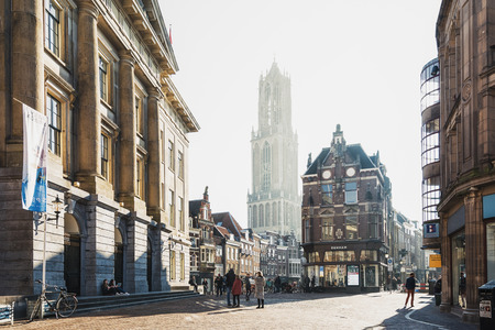 UTRECHT, NETHERLANDS - MARCH 03, 2014:: People walking on the old town street, in front of the Dom Tower. Cathedral (Dom) tower is the symbol of the city and the tallest church tower in Netherlands.