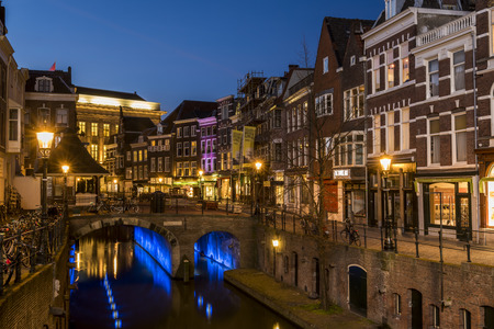Dom Tower, bridge and canal Oudegracht in the night colorful illuminations in the blue hour, Utrecht, Netherlands