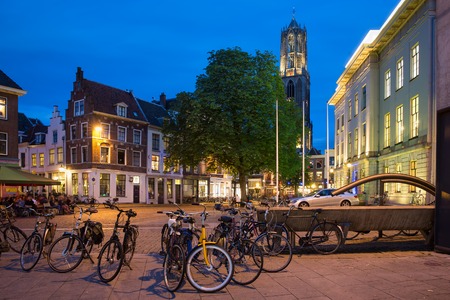 UTRECHT, THE NETHERLANDS - JUNE 30: Parked bicycles in the evening near Dom Tower on June 30, 2016 in the centre of Utrecht, The Netherlands