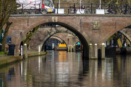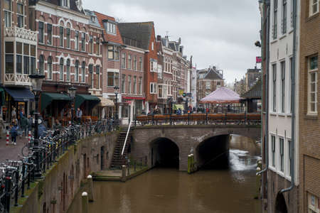 Utrecht, the Netherlands - 16 Mar, 2020: View over the Oudegracht canal in the medieval city centre of Utrecht