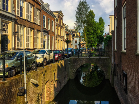 An amazing view of the old canal with bridges and a cozy street with beautiful houses, cars and bicycles. Utrecht, Netherlands