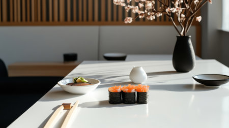 A sushi set on clean white table with minimal decor