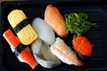 Sushi set in plastic box on black background. Top view.