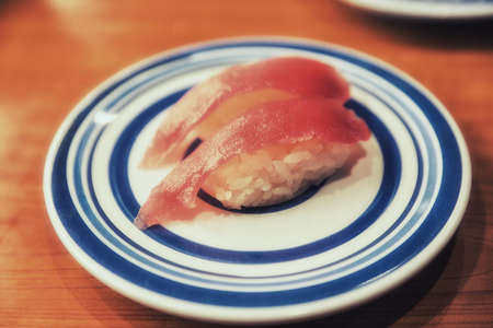Sushi on conveyor belt in a Japan restaurant. Traditional Kaitenzushi Japanese food. Shushi Go Round is a famous form of fast food in Asia, also known as sushi train.