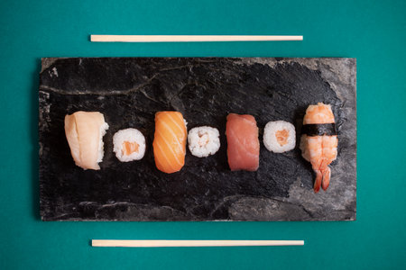 Sushi set on black stone plate, japanese food style