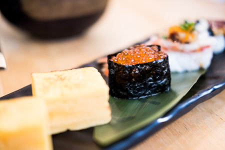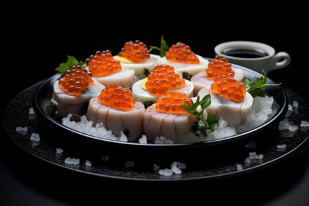 Salmon eggs sushi on a black plate. Selective focus