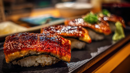 Grilled eel sushi is carefully arranged on a black plate in a cozy Japanese restaurant. Fresh wasabi and garnish add vibrant colors to the dish. This serves as a delightful evening meal.