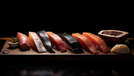 Fresh seafood sashimi plate, a gourmet Japanese delicatessen collection generated by artificial intelligence