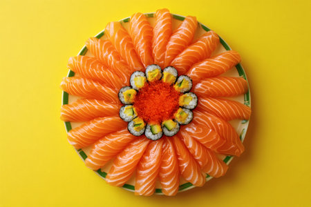 Sushi flower arrangement with salmon roe and California rolls on a round plate against a yellow background.