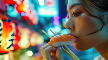 Asian woman eating sushi in japanese restaurant, young female holding chopsticks and eating salmon sushi in lunch time in summer. Lifestyle women eating traditional food concept.