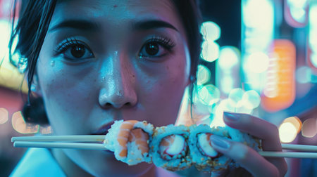 Eating Sushi Rolls with Chopsticks in Hands, Taking Sushi Roll, Eating Susi in Japanese Restaurant Closeup, Generative AI Illustration