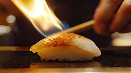 A sushi chef gently torching a piece of aburi nigiri, creating a smoky, flavorful finish.