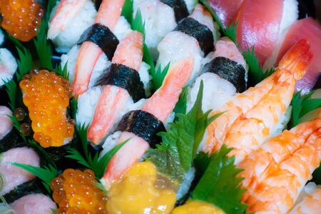 Assorted sushi on plate with variety of Japanese sushi such as tuna, prawn, salmon, eel and egg