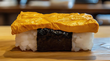 A piece of uni sushi with a rich golden hue on top of delicate rice.