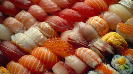 An overhead shot for the Japanese Cuisine Poster, various types of sushi or nigiri, slices of fresh fish atop small mounds of rice, full fill on the background, Generated by AI.