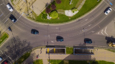 Overhead drone shot of beautiful park and busy roundabout