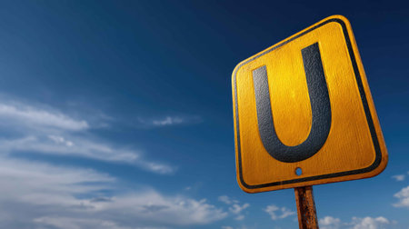 A vivid yellow warning sign features the letter U, set against a clear blue sky. This eye-catching image conveys safety and alertness in transportation and urban settings.