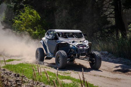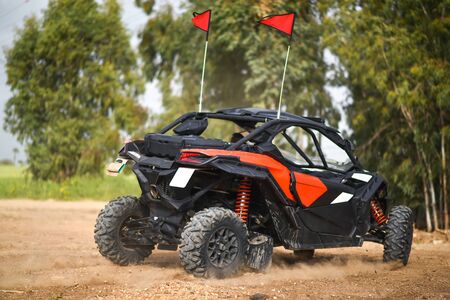 Outdoor activities UTV buggy moves on a dusty road. 4x4, extreme, adrenalin.