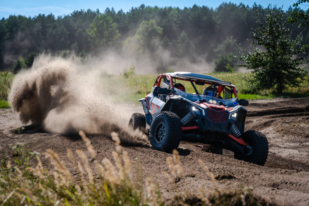 UTV buggy, 4x4 competition on a dusty road. Rally, extreme, adrenalin