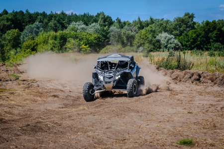 ATV, UTV, buggy, rally riding in a dusty track. Amateur competitions