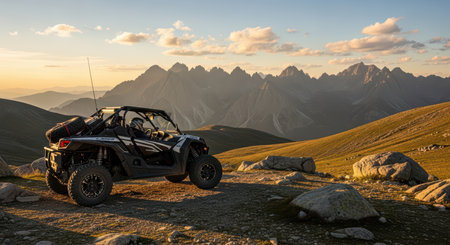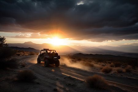 off-road vehicle approaching sunset, with the sun shining through the clouds, created with generative ai