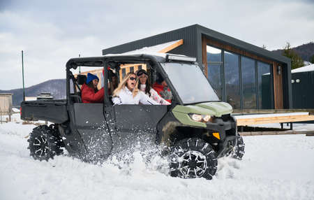 Happy women riding on off-road buggy car. Contemporary barnhouse on background. Concept of active leisure and winter activities.