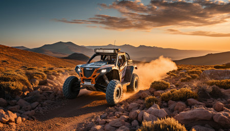 a dynamic scene of off road atv driving through a stunning desert landscape, bathed in the warm, golden glow of either a sunrise or a sunset