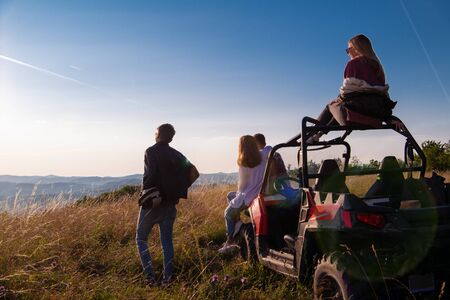 portrait of group young happy people enjoying beautiful sunny day while driving a off road buggy car on mountain nature