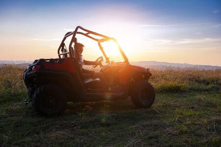 portrait of young happy excited man enjoying beautiful sunny day while driving a off road buggy car on mountain nature