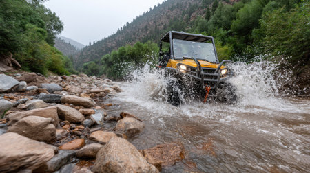 A thrilling off-road vehicle splashes through a rocky river, showcasing the excitement of outdoor adventures in a stunning natural landscape.