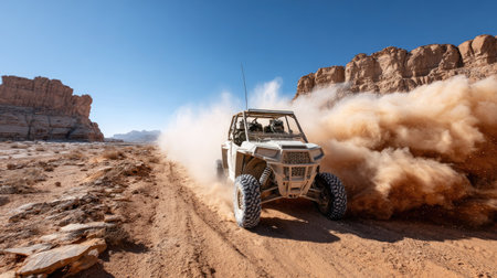 Exciting off-road experience captured in a stunning desert landscape showcasing an all-terrain vehicle kicking up dust in motion. Perfect for adventure.