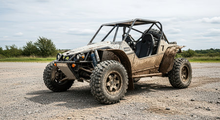 Rugged off-road dune buggy covered in mud on gravel terrain