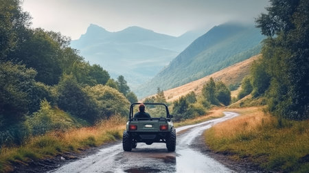 Adventurous Open Vehicle Journey Through Wet Forest Path Leading to Misty Mountains Viewpoint